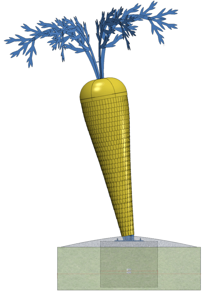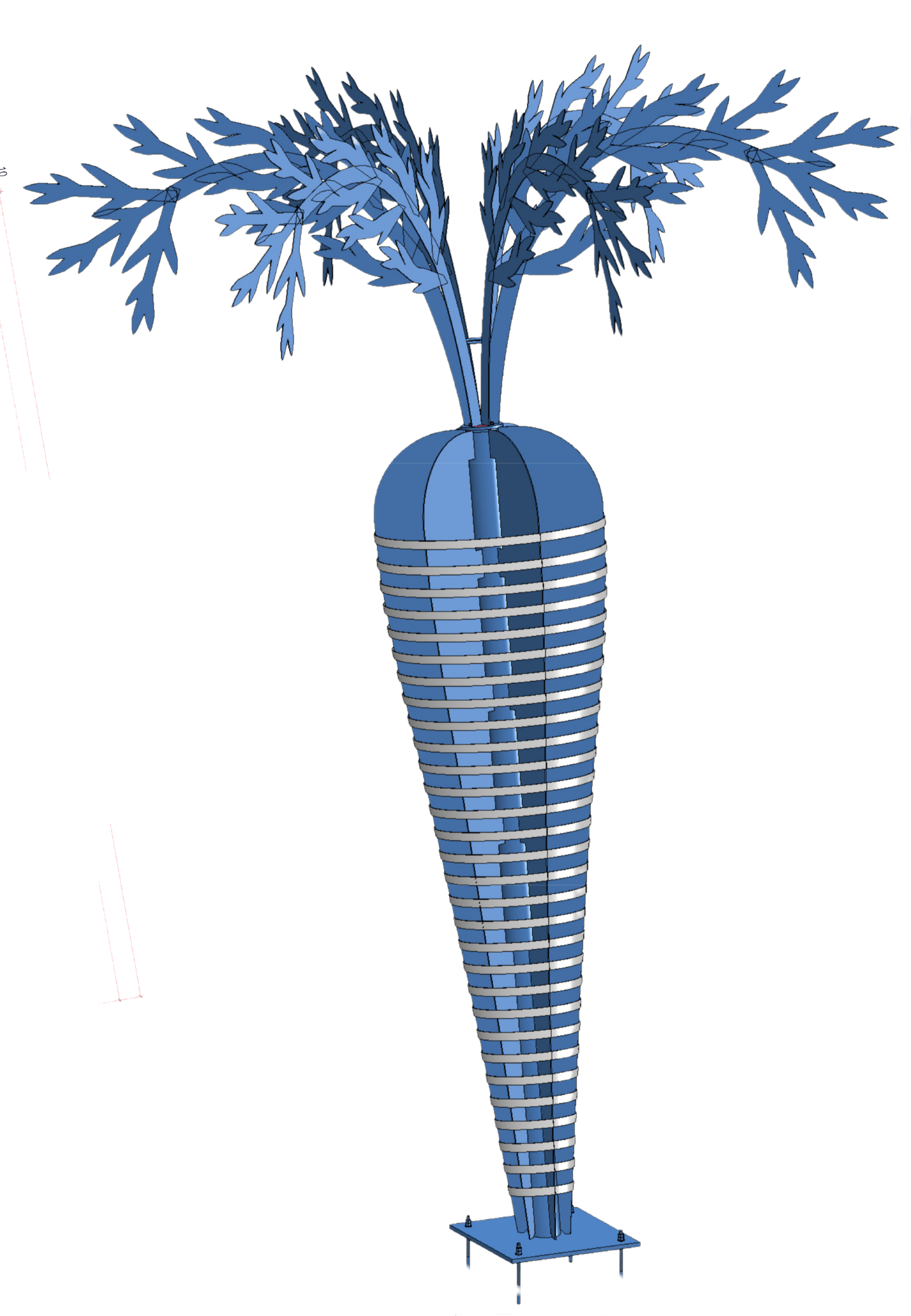 Eine Stahlkonstruktion, aufgebaut aus Ringen und Profilen, die das Rüebli in seiner Form nachbilden. Die Unterkonstruktion erstellen wir den Räumlichkeiten der Berufsschule Lenzeburg.